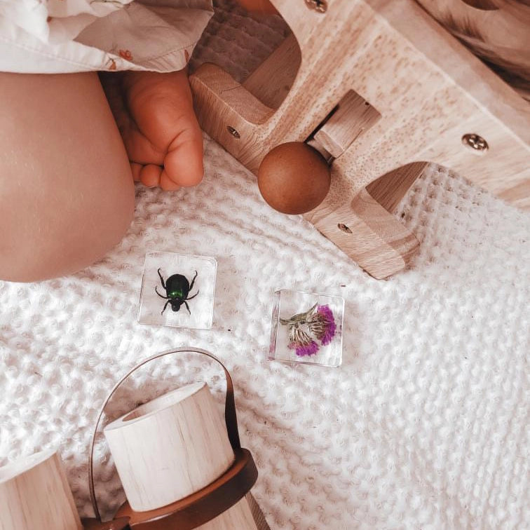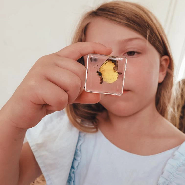 • Six preserved specimens: Honeybee, Little Yellow Butterfly, Chafer Beetle, Ladybird, French Marigold Flower, Forget-me-not Flower; encased in crystal-clear resin (40x40x20mm; approx. 1.6" x 1.6" x .8")