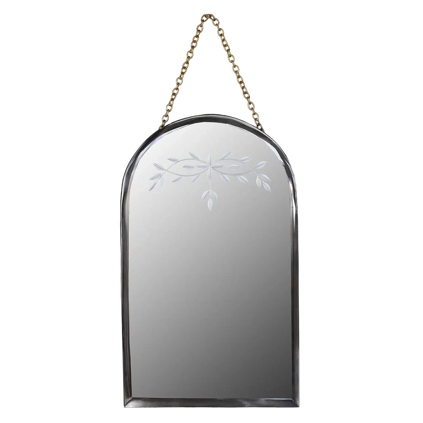 Each unit features a wood back for lasting durability and a delicate thin-leaf motif etched along the bevel, enhancing its artisanal character. Hanging is courtesy of an antique-brass-finished chain, and the piece is designed to pair beautifully with other small- and medium-sized mirrors to create an intriguing wall display. Its compact scale keeps the look light while delivering a luxurious feel, and the durable construction supports long-term use with a reduced need for replacement—an eco-conscious choice for stylish interiors.