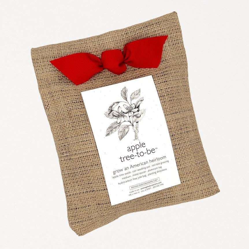 The Apple Tree To Be is a meaningful living gift handcrafted in Idaho with everything needed to grow an apple tree from seed. The kit includes the young Malus pumila sprout, a coir seedling pot, OMRI-listed soil, a metal saucer, and an aluminum tag ready for a personalized message, all tucked into a natural jute bag. From seed to sprout, the materials are chosen for longevity and ease, making planting simple for beginners and gratifying for experienced gardeners.