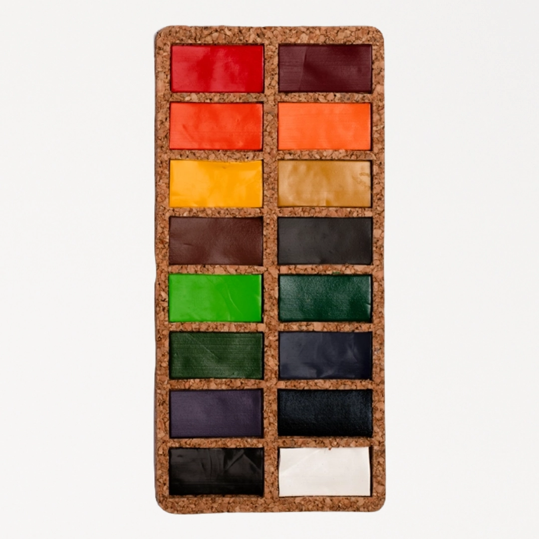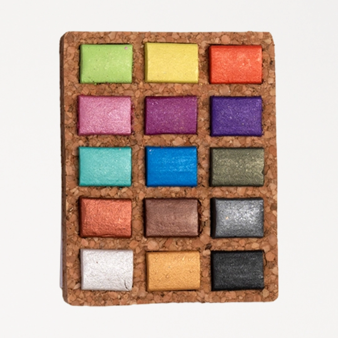 Crafted on a fully biodegradable cork base, these watercolor palettes offer artists a lightweight, eco-conscious tool designed for everyday creativity. Each palette is assembled by hand and features premium pigments—either 16 rich original colors or 15 soft metallic shades—formulated for smooth, expressive washes. The natural cork foundation provides a tactile feel and durable structure, while the compact design makes each palette easy to use at home, in the studio, or on the go. A swatch card and built-in mixing surface accompany the original palette for organized color testing and effortless setup.